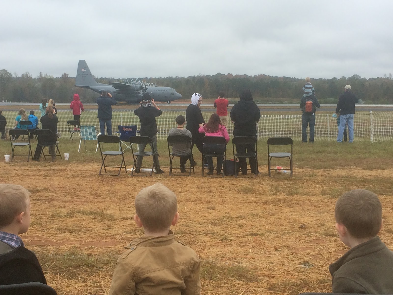 Today we met the Hembrees out in Fayetteville to see the Blue Angels. Their church held a service outside and then we were expecting a show. Church was great, they put up a tent and we stepped over the mud, and then there was a lot of waiting, because it was a little rainy and very cloudy. The show got delayed so we walked around, looked at the planes and got some snacks. The boys loved the funnel cake! Then we waited some more and finally they were able to do one fly over, but no tricks or anything because the weather just wouldn't cooperate. At least we got to be together as a family all day!